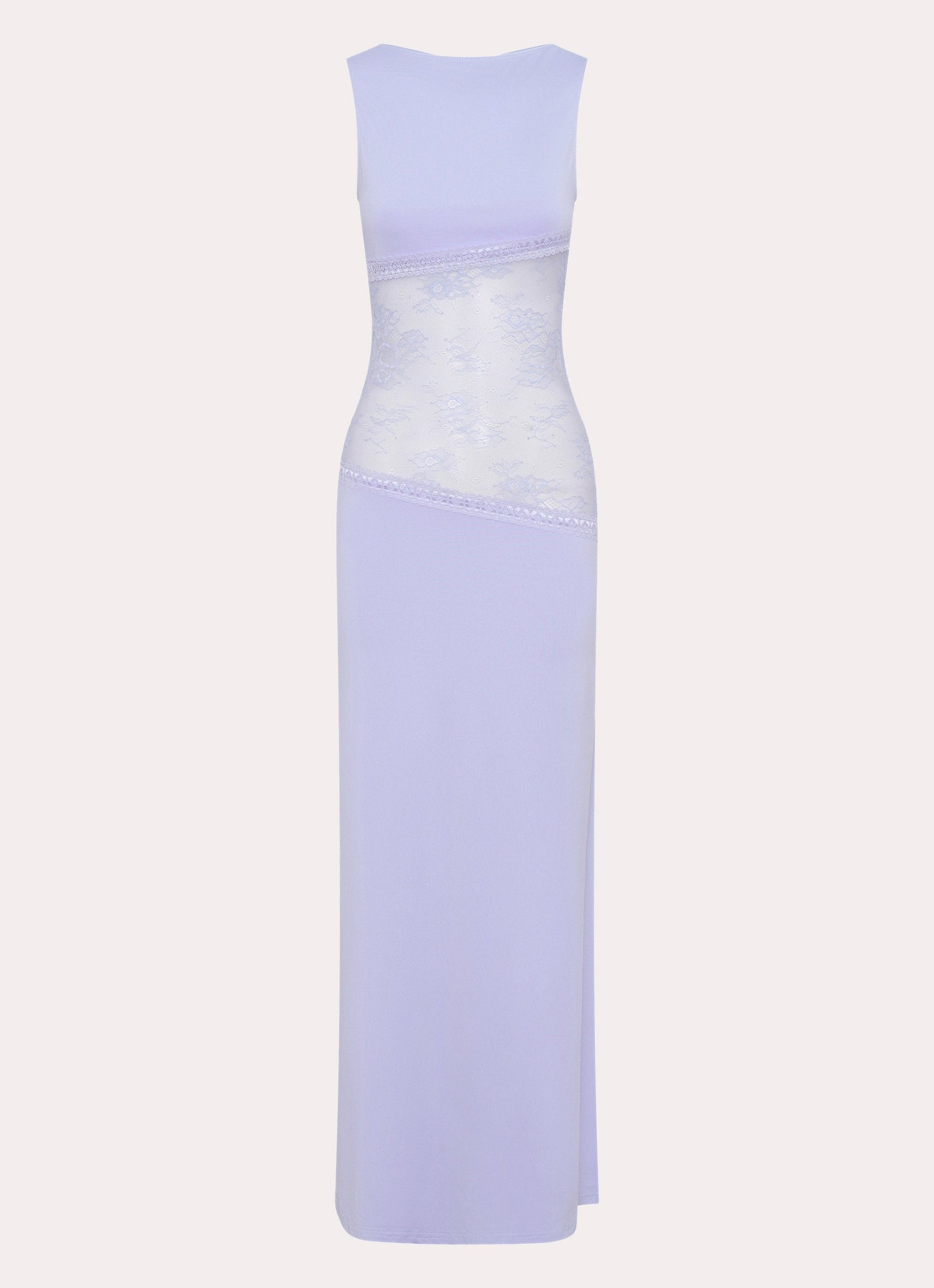 Model draagt een lila maxi-jurk met kanten inzetstuk rond de taille – elegante en moderne avondjurk in een verfijnd ontwerp.Model draagt een lila maxi-jurk met kanten inzetstuk rond de taille – elegante en moderne avondjurk in een verfijnd ontwerp.